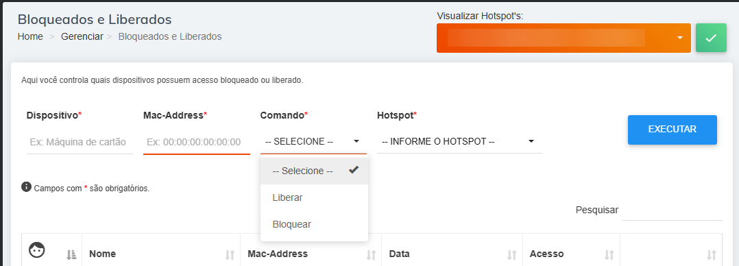 É necessário informar o nome do dispositivo, MAC Address, comando (se seria para liberar ou bloquear o acesso) e o ponto (Licença) do Hotspot Social, após isto, clique em "Executar", será realizado o comando. 🙌