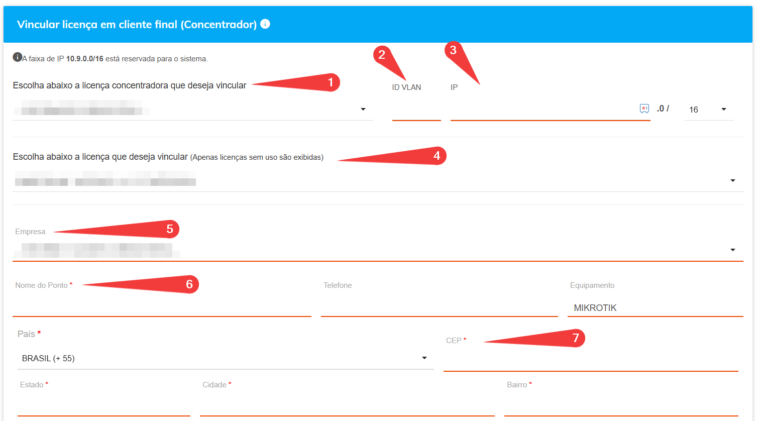 Na tela de cadastro da licença Hotspot ao concentrador, preencha os campos conforme abaixo.