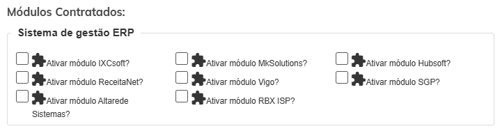 Se necessário, ative os módulos abaixo para utilizar em seu cliente como, por exemplo, o módulo IXCsoft. Para ativar um módulo, marque a caixa correspondente ao desejado.
