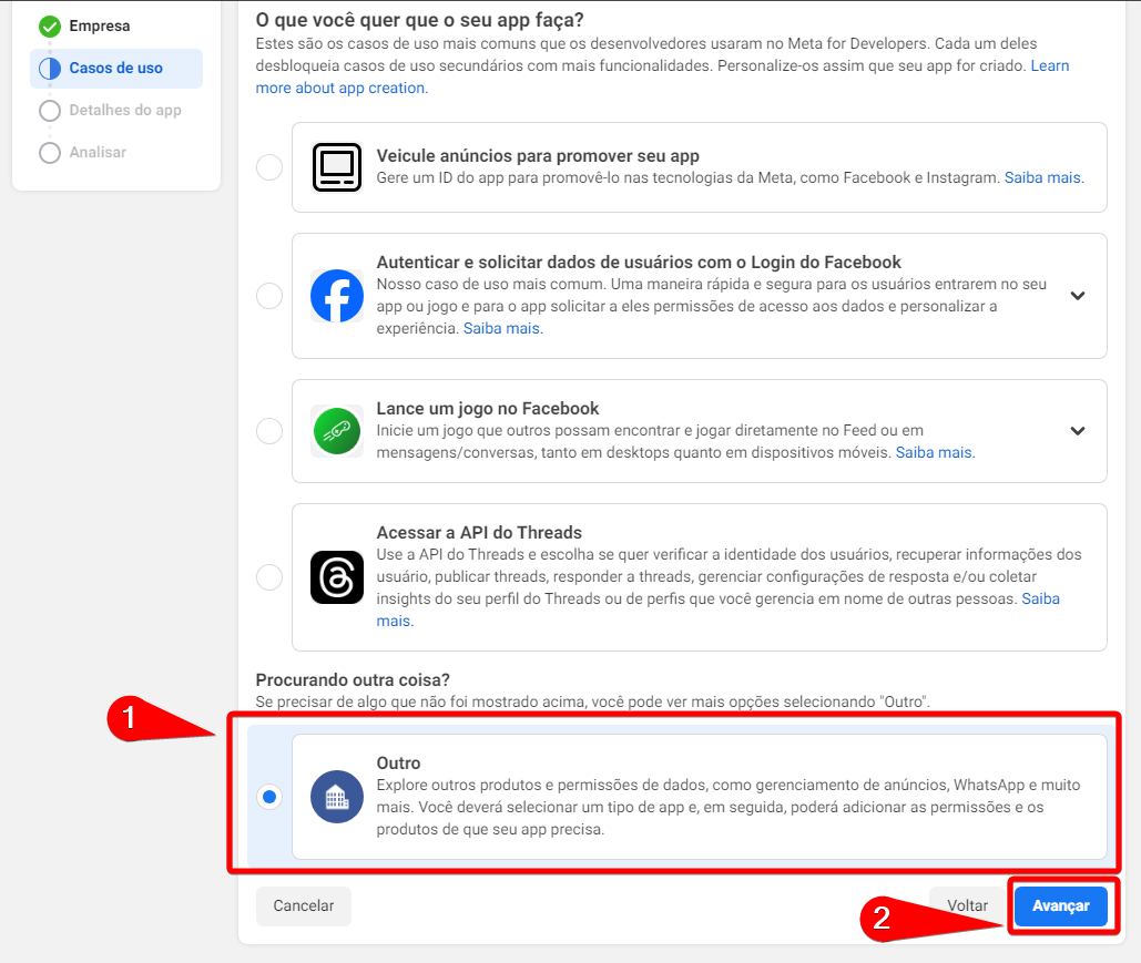 Importante: Se sua conta Facebook não for uma conta de desenvolvedor, solicite a migração de sua conta para uma conta de desenvolvedor do Facebook.