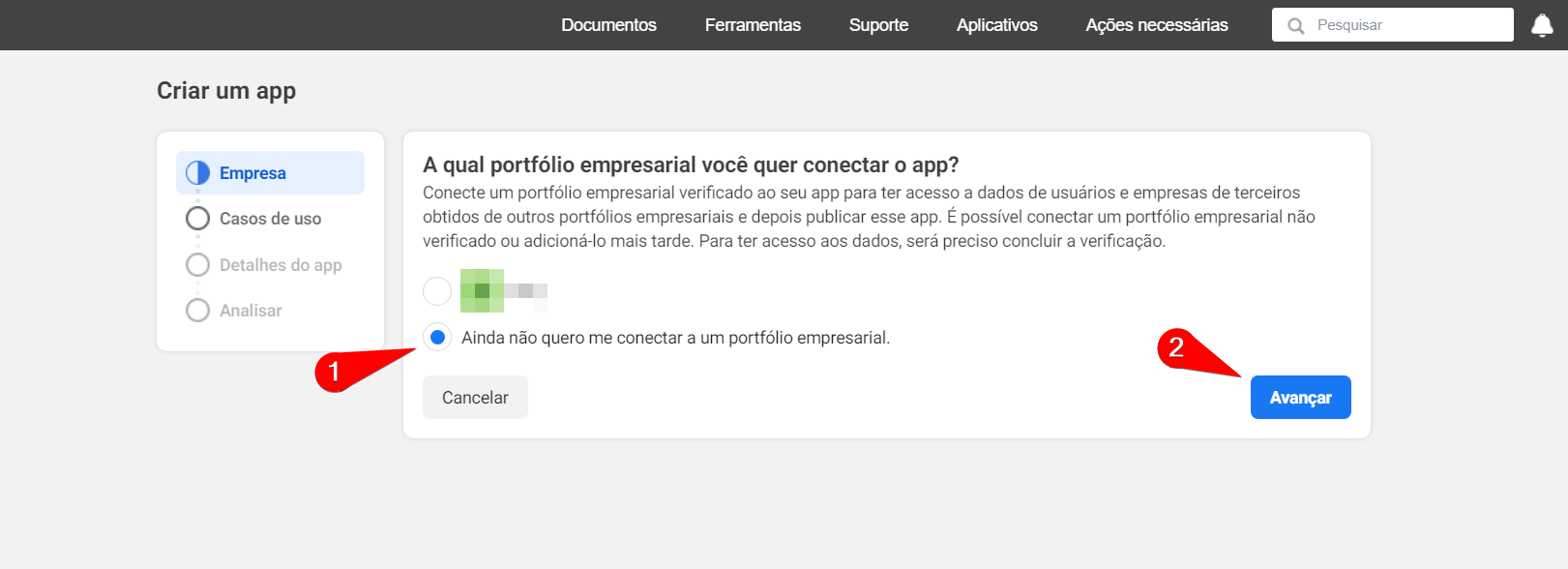 Selecione a opção 'Ainda não quero me conectar a um portfólio empresarial' e depois clique em Avançar
