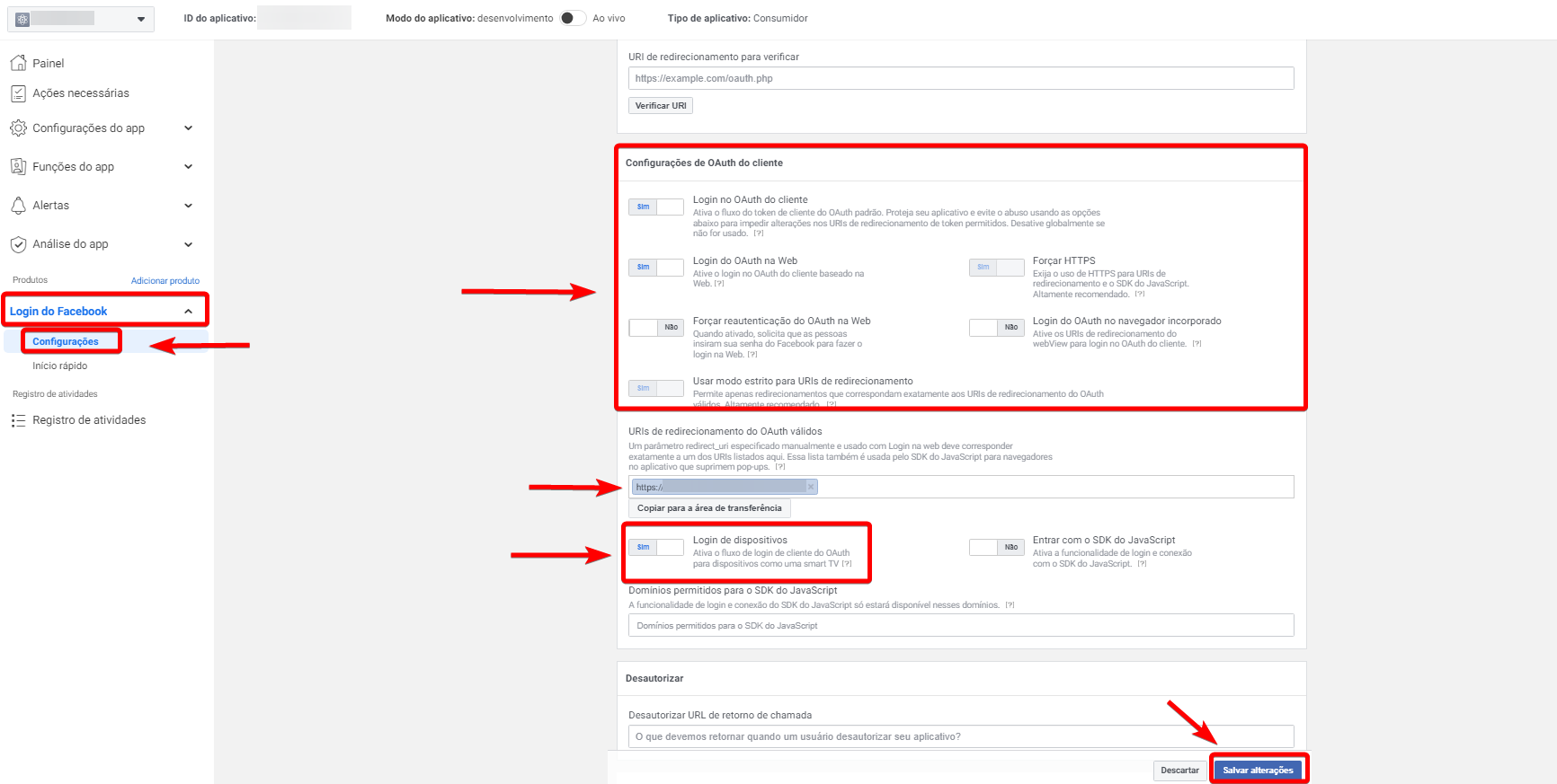 No menu lateral, clique em Login do Facebook > Configurações. Em seguida, nas Configurações de OAuth do cliente mantenha as chaves como na imagem abaixo.