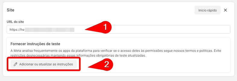 Em Site, preencha o campo URL do Site com a URL do domínio escolhido (seu domínio personalizado), clique em Adicionar ou atualizar as instruções.