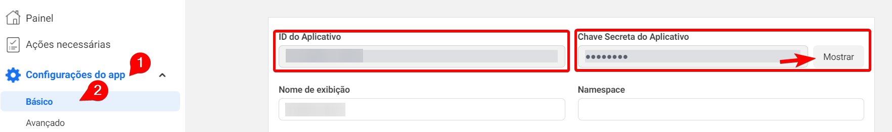 Em seu aplicativo, vá ao menu Configurações > Básico. Na ela que se abrir, você verá o ID do aplicativo (Facebook App ID). Ao lado, você verá a Chave Secreta do Aplicativo (Facebook App Secret) que está "escondida". Para mostra-lá, clique em Mostrar e digite a senha de sua conta do Facebook.