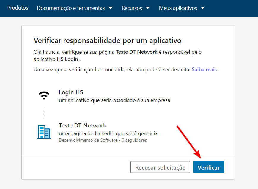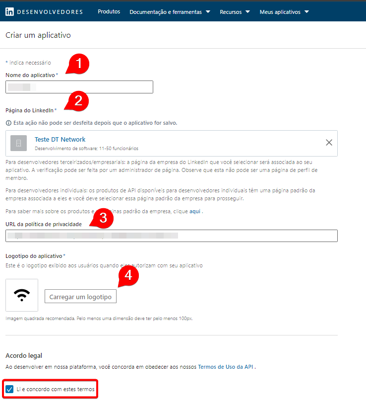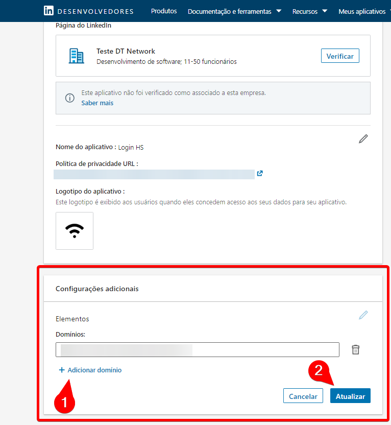 Página do LinkedIn: Página que será associada ao seu aplicativo.