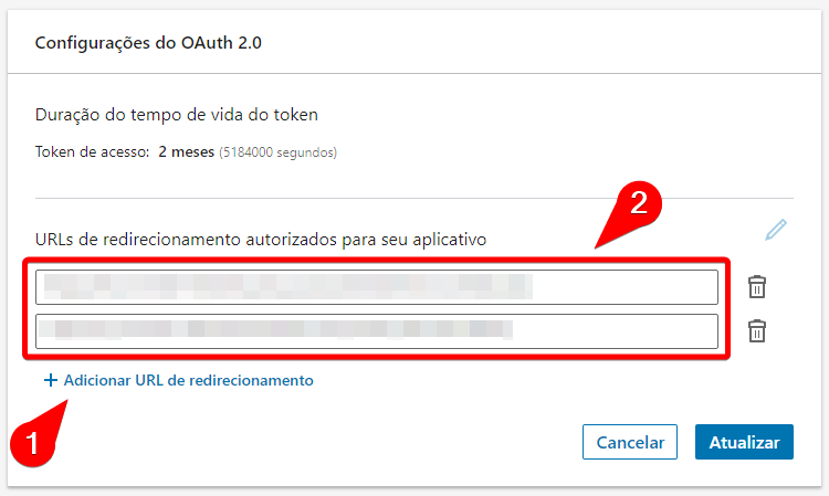 Vá para a aba Autor, clique no ícone de lápis para editar a opção Configurações do OAuth 2.0, clique em Adicionar URL (clique duas vezes).