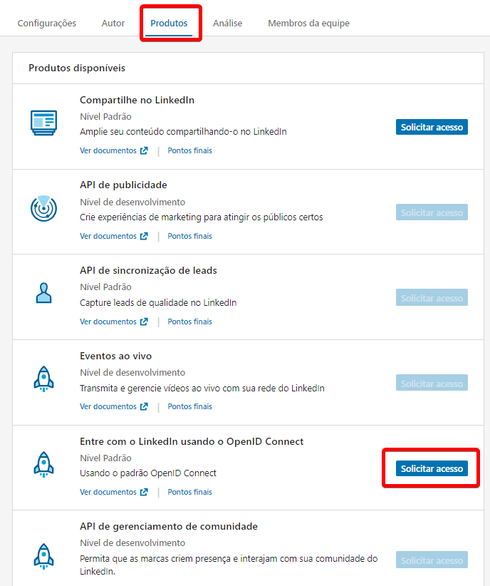 Clique na aba Produtos e clique em Solicitar acesso correspondente ao produto Entre com o LinkedIn usando o OpenID Connect.