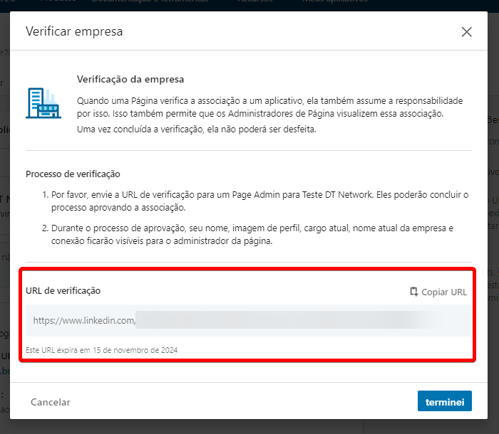 Na tela que abriu, gere e copie a URL de verificação e clique em terminei.