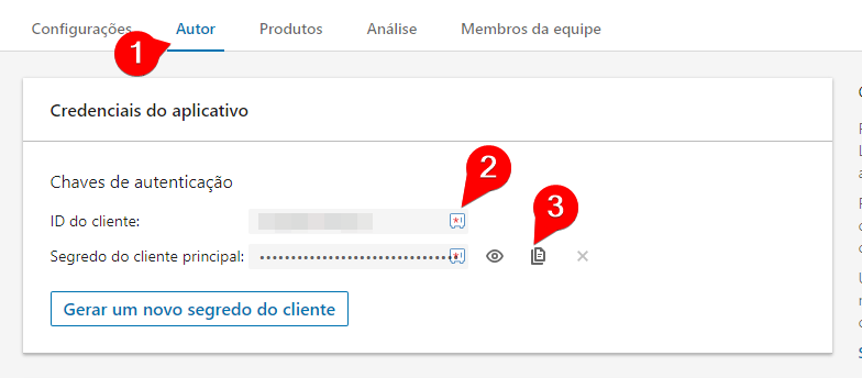 Obs: Para copiar o Segredo do cliente principal, basta clicar no ícone de papel localizado ao lado no campo.