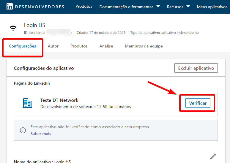 Para saber seu LinkedIn Client ID e LinkedIn Client Secret, dentro de seu aplicativo, faça como abaixo.