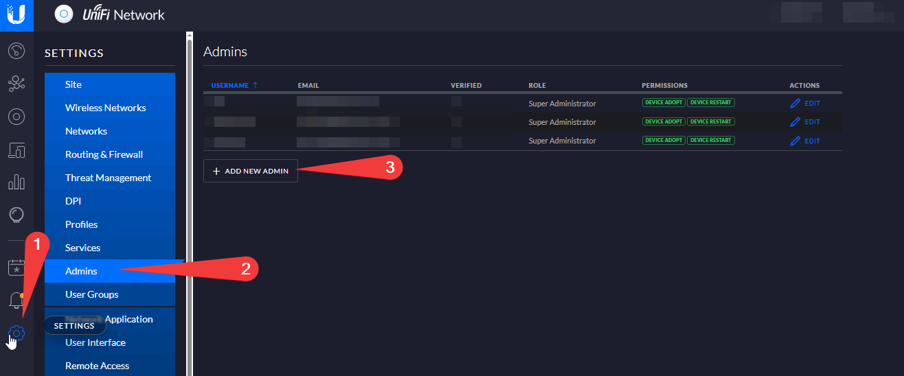 Na controller com a visualização "Legacy", acesse o menu Settings > Admins e clique em "add new admin"Após, crie o usuário definindo ele com a permissão de "Administrador", também, desmarque a opção "Remote Acess" (O usuário deve ser criado como local controller para conseguir fazer a comunicação e configurações.)