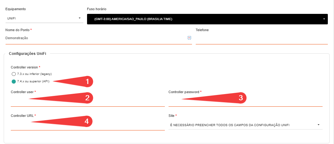 Agora, preencha os dados, ao escolher a opção de equipamento "UNIFI", será exibido o campo para escolher se a instalação vai ser na versão 7.3 ou inferior, ou na versão 7.4 ou superior, escolha a 7.4.