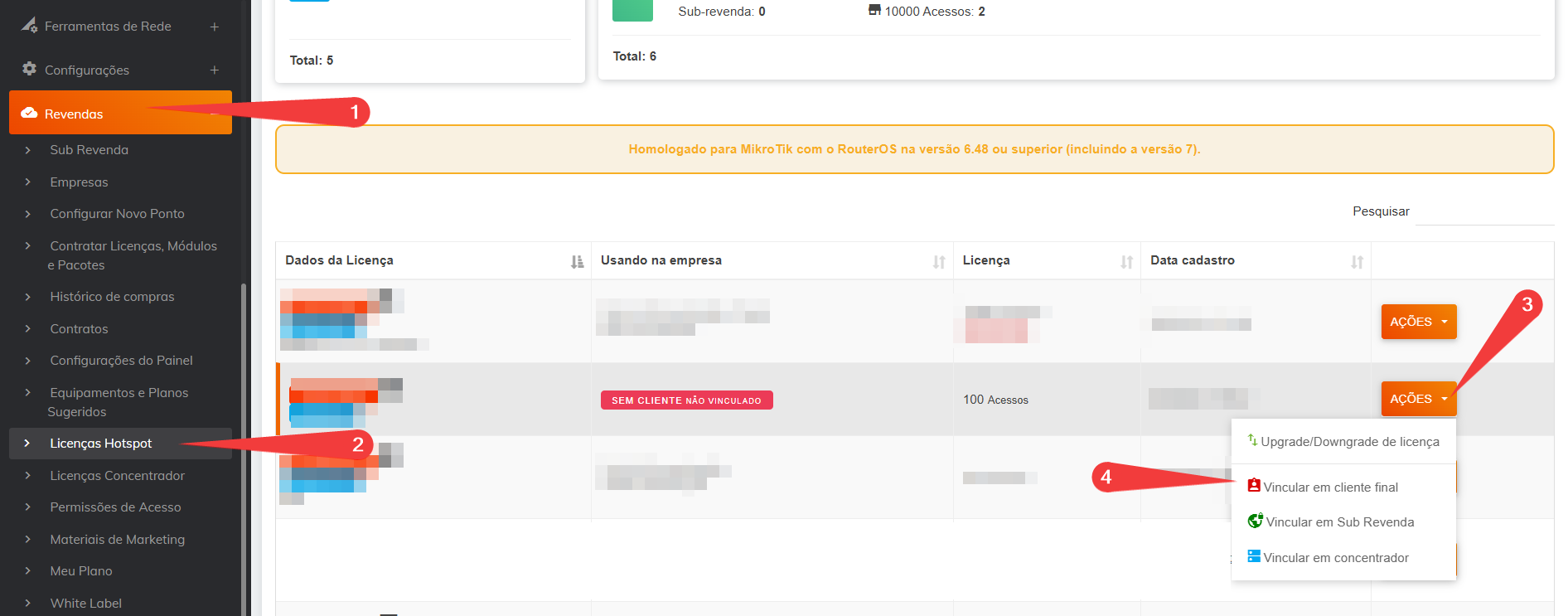 Com o usuário criado, acesse agora o painel do Hotspot Social para vincularmos a controller na licença que vai ser instalado, vá no menu Revendas > Licenças Hotspot, localize a licença que vai instalar e clique em Ações > Vincular Cliente Final: