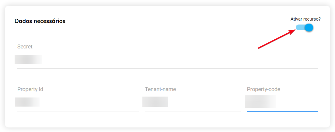 Os dados utilizados na integração, devem ser solicitados pelo Hotel para a empresa App Sistemas Hits. Com os dados em mãos, preencha os campos abaixo e habilite a chave Ativar Recurso?.