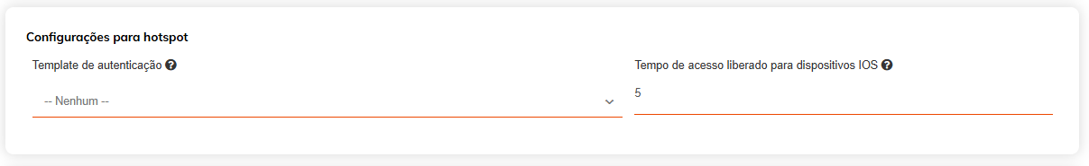 Seguindo abaixo das configurações para campanha, você vai ter as "Configurações para Hotspot", aqui você vai escolher o Template que será enviado quando o usuário for se autenticar por WhatsApp ou validar o número (O Template já precisa estar criado no Chat Corp, veja como fazer clicando aqui), além disso, você consegue escolher quanto tempo de acesso à internet será liberado em iOS para receber a mensagem no WhatsApp (Para o Android essa configuração é automática)