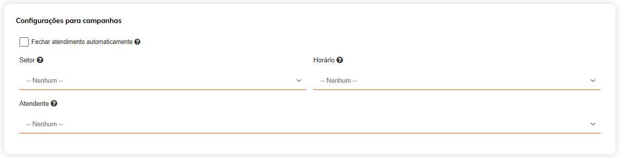 A primeira configuração abaixo, ainda na mesma tela, será "Configurações para Campanhas", esse campo serve para definir o que será feito quando uma campanha for enviada pelo Hotspot Social, se o atendimento do contato será fechado no Chat Corp ou se ele será definido para algum setor ou atendente, e se deve ser enviado somente em um horário específico, como "expediente", por exemplo.