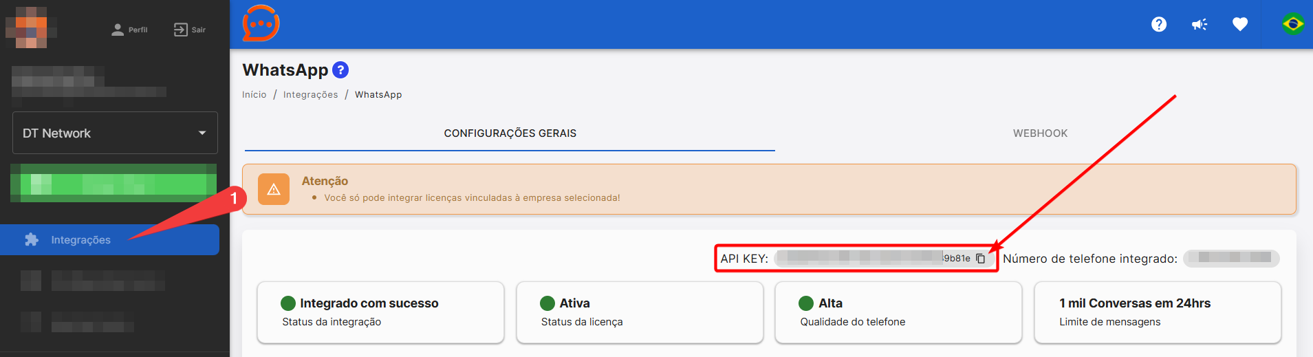 Após copiar a API KEY no Chat Corp e colar dentro do Hotspot na tela da integração, basta clicar fora do campo de digitação, a integração será salva e estando correto vai aparecer o número vinculado e o plano do seu Chat Corp!