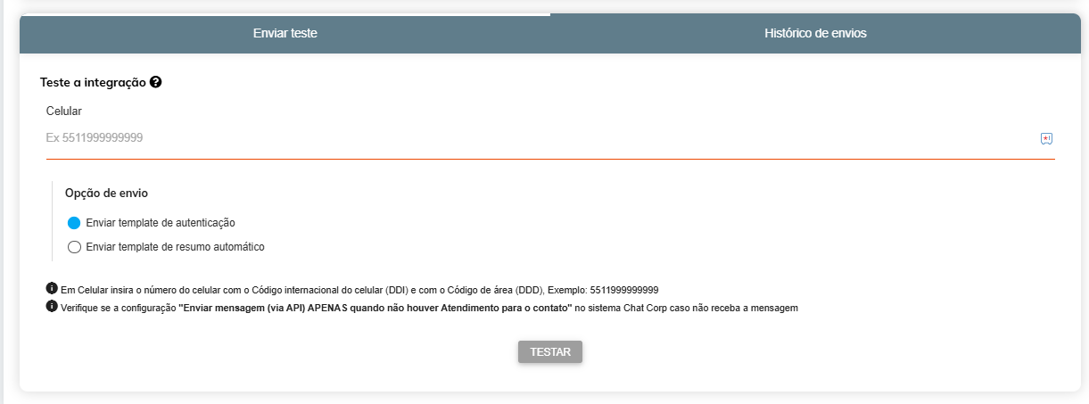 Caso ainda queira fazer um teste antes de ativar os recursos, no final da tela você tem um campo de teste, onde pode informar um número e escolher qual Template deseja testar, o de autenticação ou do resumo automático.