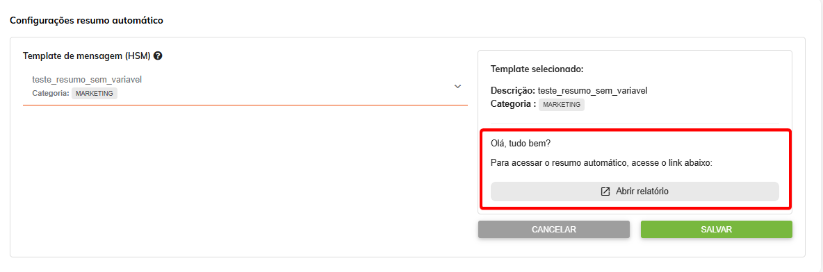 A última configuração possível na tela é sobre o envio do resumo automático, onde também é necessário escolher um Template já criado no Chat Corp, na direita, você consegue visualizar o conteúdo do Template, para validar como você vai receber essa mensagem.