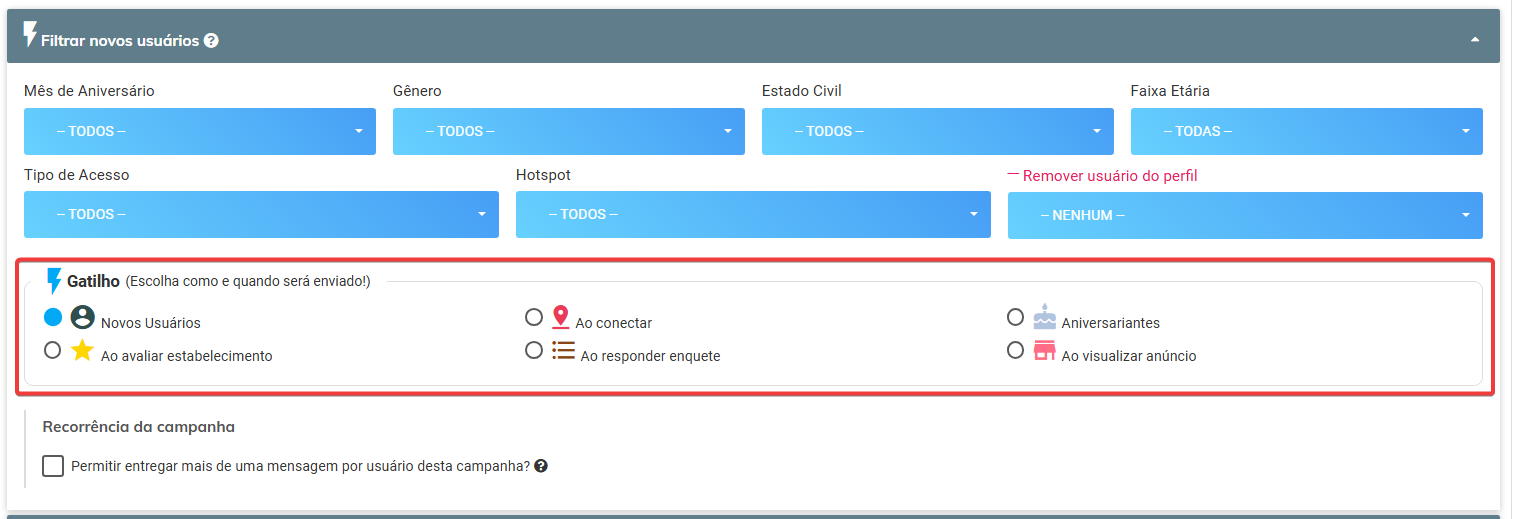 Use filtros como Mês de Aniversário, Gênero, Estado Civil, Faixa Etária, entre outros, para segmentar o público da campanha, ou mantenha o padrão com todos os públicos selecionados.