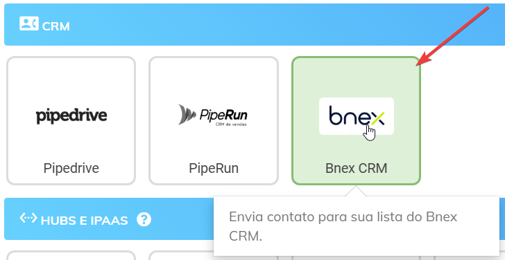 Em Modo de Envio, escolha a opção Bnex no campo CRM.