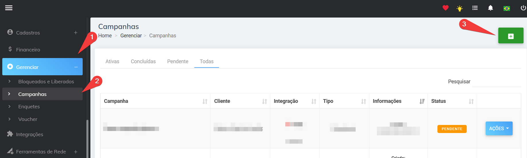 Após a configuração, vá ao menu Gerenciar > Campanhas.