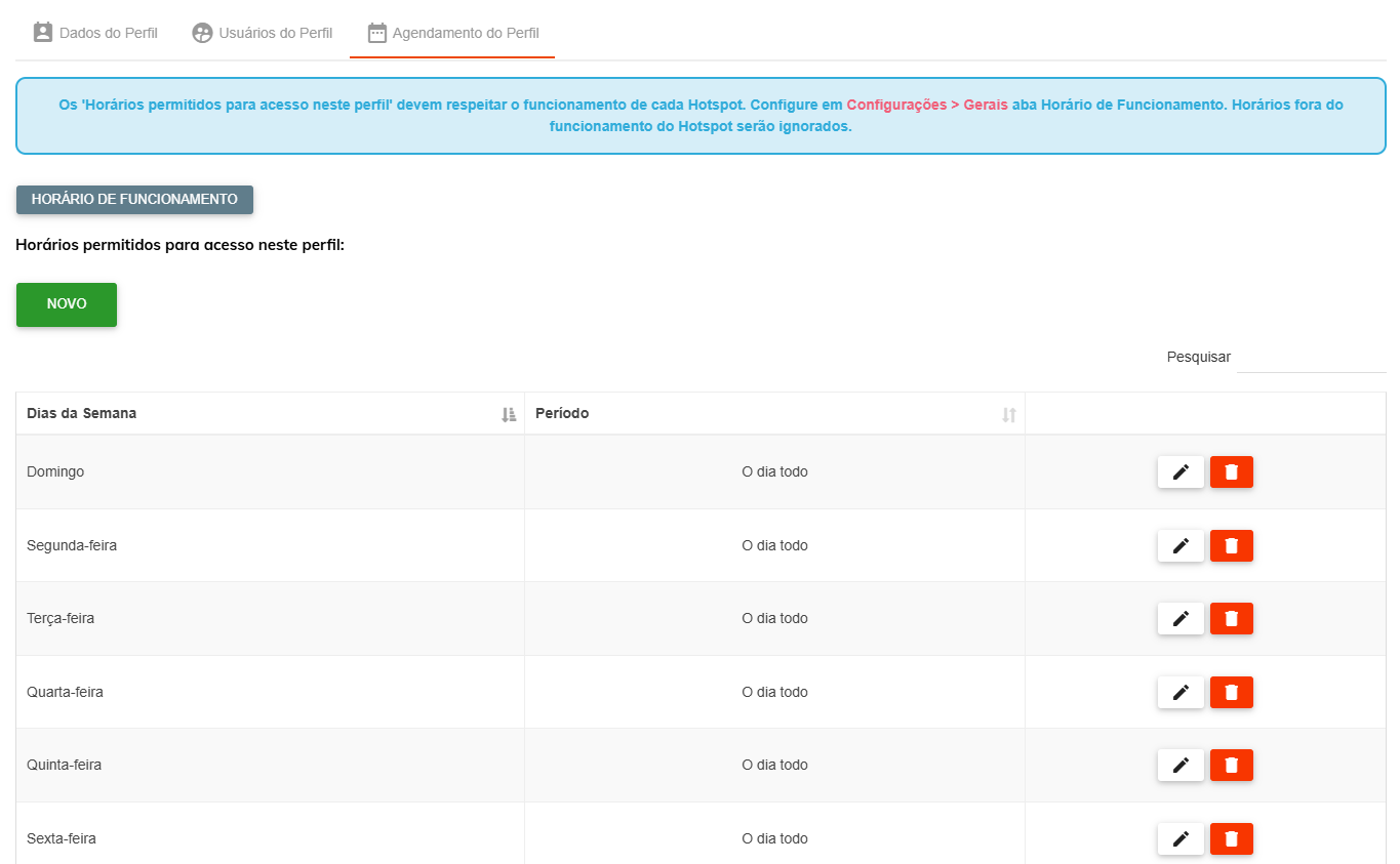 Na aba "Agendamento do Perfil" é possível configurar as datas horários de funcionamento desse perfil em específico, ou seja, os usuários só vão poder se conectar nas datas e horários configurados. Lembrando que esse horário precisa estar disponível no menu "Configurações > Gerais > Horários de Funcionamento".