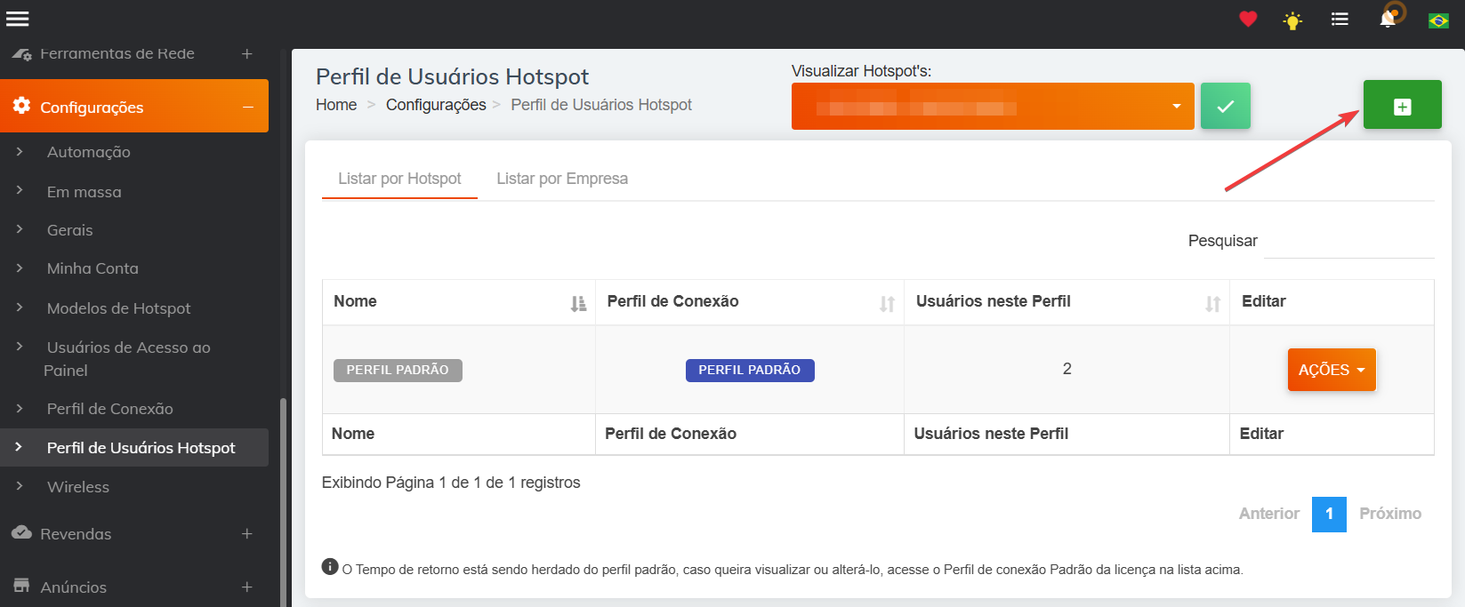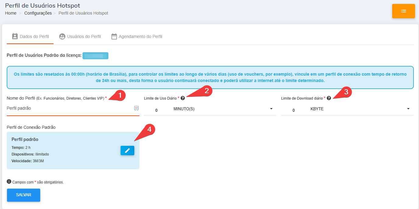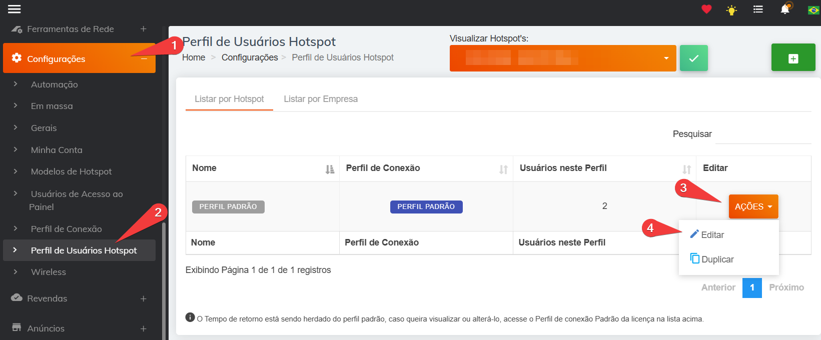 No menu lateral do lado esquerdo acesse "Configurações > Perfil de Usuários Hotspot" e clique em "Ações > Editar" para editar o perfil padrão.