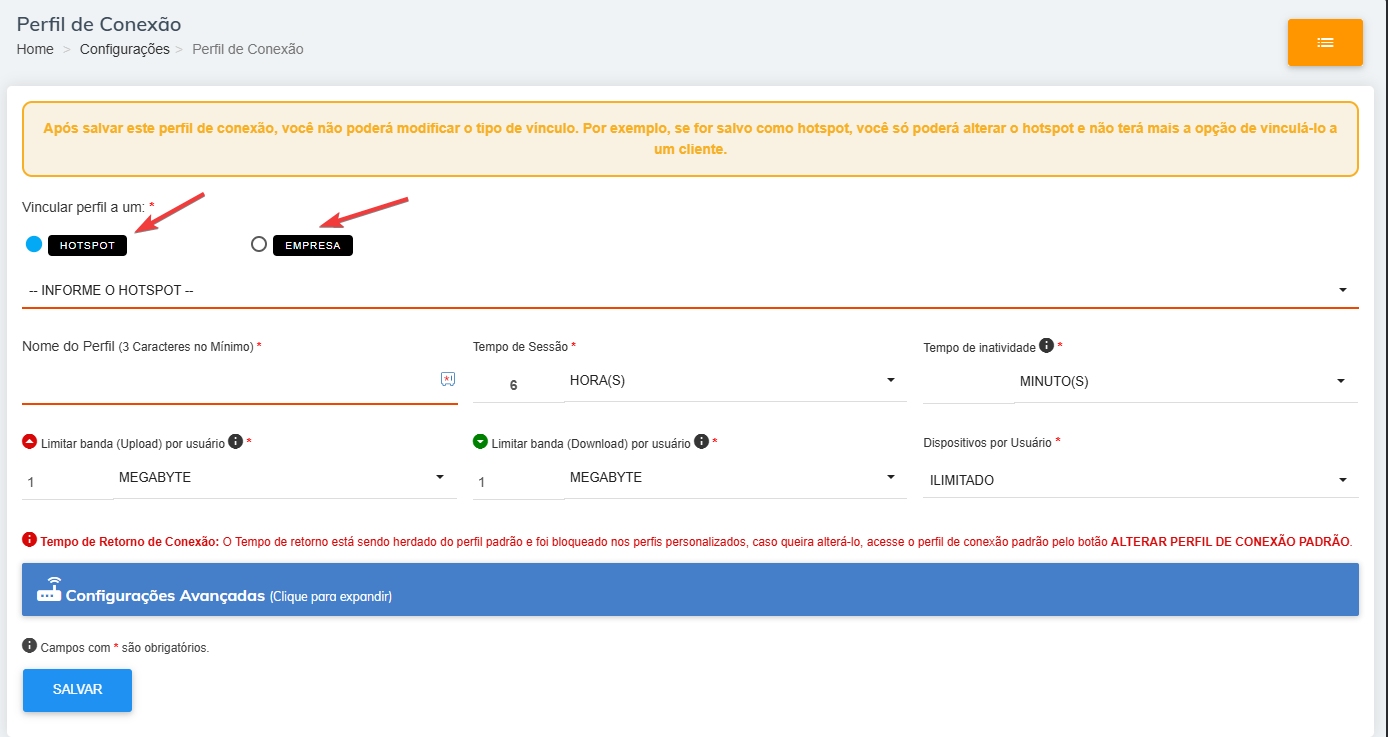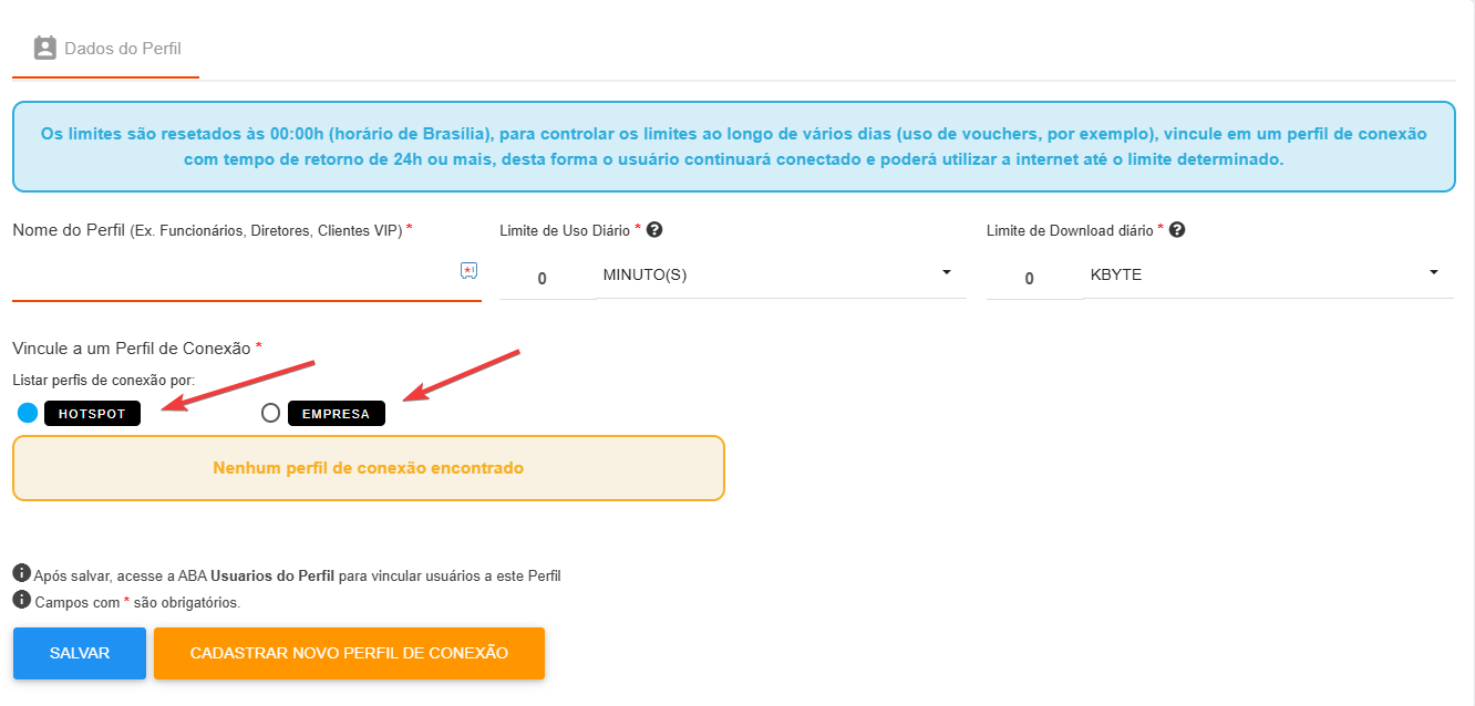 Ao clicar será aberto uma tela com os campos para preencher com as regras do perfil igual o passo a passo anterior, mas agora é possível escolher entre as opções "Hotspot" e "Empresa", onde ao selecionar "Hotspot", vai funcionar somente para o ponto que for definido e "Empresa" para todos os pontos da mesma empresa.