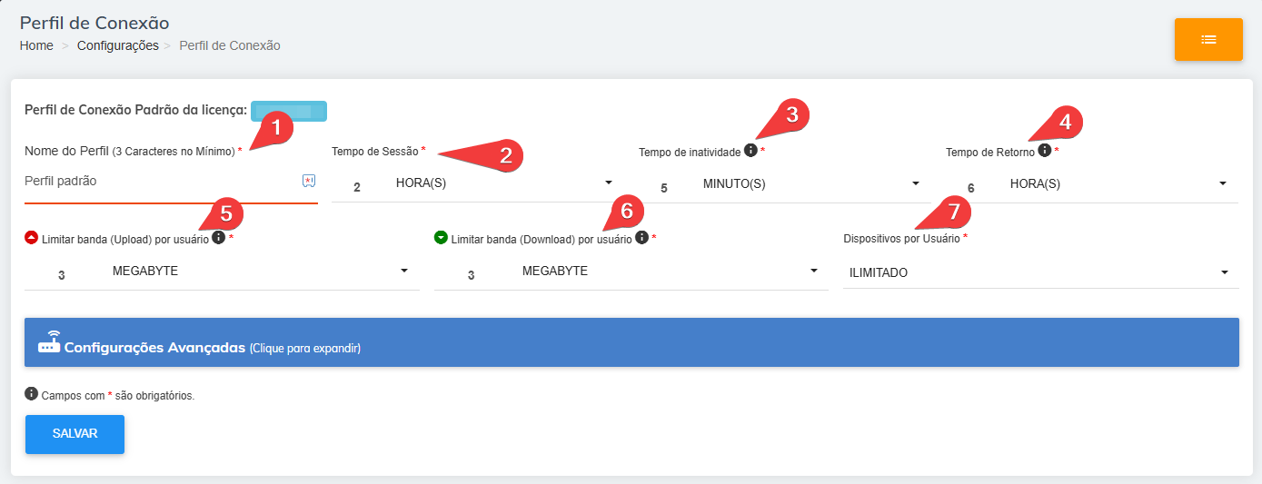 4- Tempo de Retorno: Quando o usuário sair do local, ou for desconectado por inatividade, ele vai ter esse tempo para se conectar na rede novamente sem a necessidade de realizar uma nova autenticação, isso se ele ainda tiver Tempo de Sessão. (só pode ser configurado no perfil padrão, os demais perfis vão herdar essa configuração do perfil padrão)