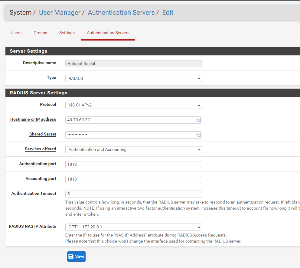 - RADIUS NAS IP Attribute: OPT1 - 172.20.0.1