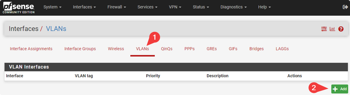 1. Acesse a configuração de VLANs do pfSense: Interfaces => Assignments => aba VLANs e clique em + Add