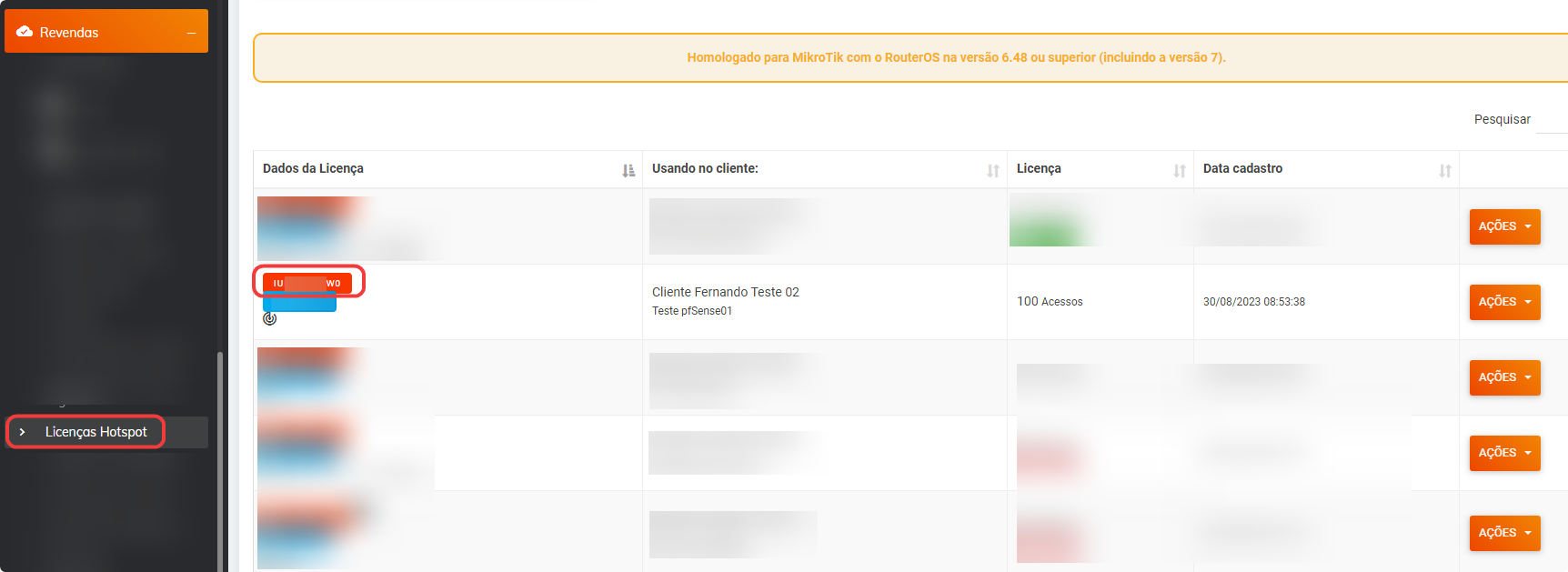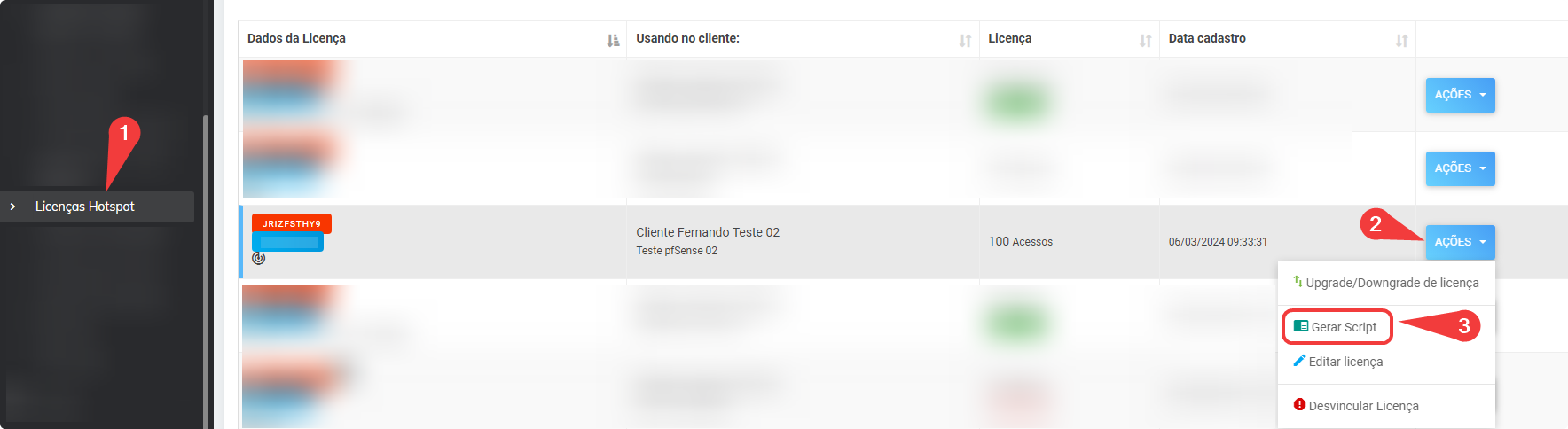- Licença do Hotspot Social que está configurada neste pfSense. Pode ser encontrada no Painel do Hotspot Social, como no exemplo da imagem: