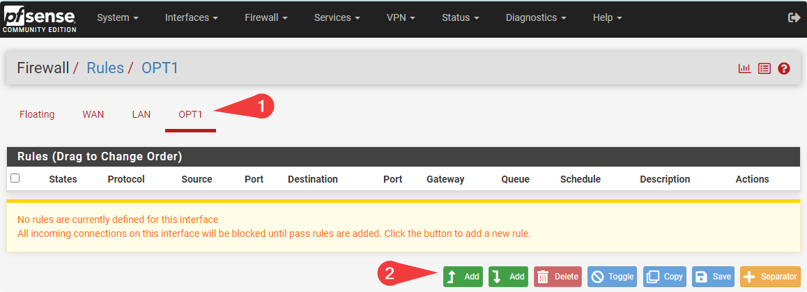 1. Criar uma regra de Firewall na interface OPT1: Firewall => Rules => aba OPT1 => Add