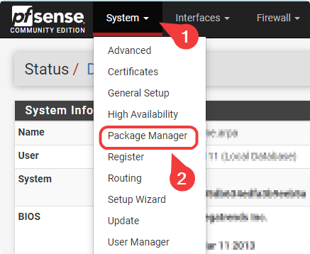 1. Acesse o Gerenciador de Pacotes do pfSense: System => Package Manager