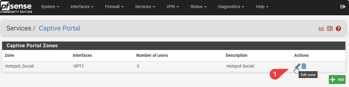 1. Acesse a configuração do Hotspot Social (Captive Portal): Services => Captive Portal => Clique em Edit Zone (ícone do lápis)