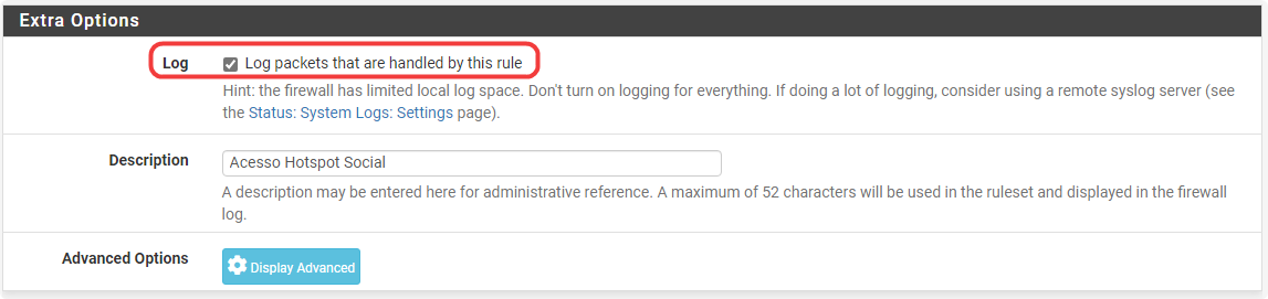 O pfSense precisa saber qual regra de Firewall irá gerar os logs.
