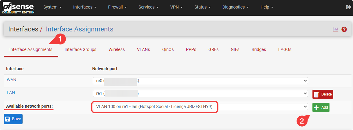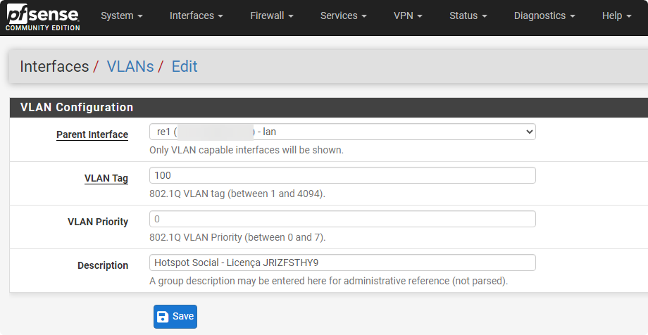 O cliente já tem um pfSense sendo utilizado como firewall de borda e, este pfSense, tem uma interface WAN e outra interface LAN. Para o Hotspot Social será criada uma VLAN que usará a interface LAN.