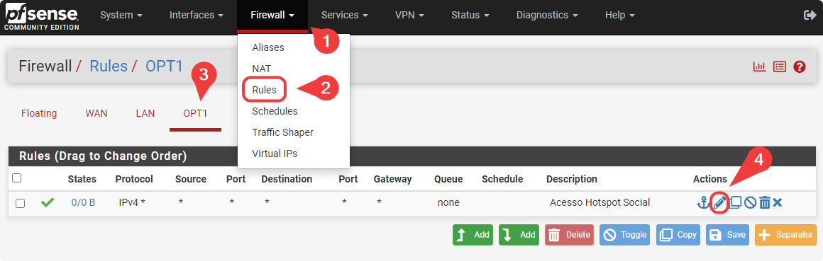 Na imagem, a interface do Hotspot Social é a OPT1, configure a regra que o seu Hotspot Social esteja usando.