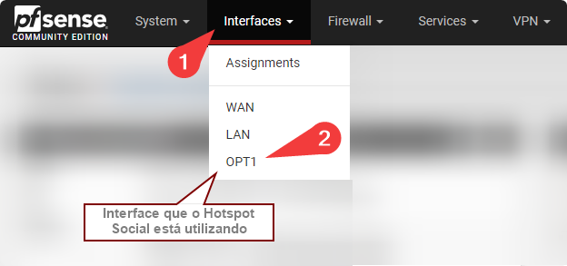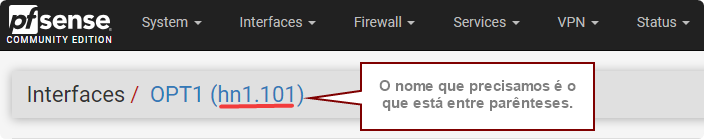 - A Interface de rede do pfSense que o Hotspot Social está utilizando. Se for interface física será no formato "re1", "hn0" ou algo semelhante. Se for interface virtual (VLAN), o nome será o mesmo da interface física onde a VLAN está configurada seguido de um ponto e do ID da VLAN. Essa interface pode ser encontrada da seguinte forma: