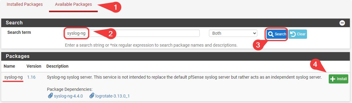 2. Clique em Available Packages e procure pelo pacote syslog-ng, clique em + Install e aguarde a instalação terminar.
